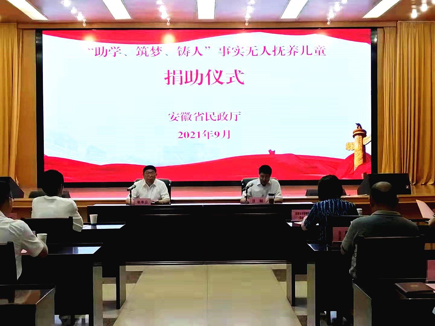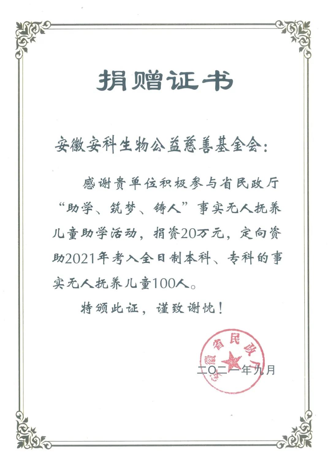 9月10日下午,“助學、筑夢、鑄人”事實無人撫養兒童捐助儀式在安徽省民政廳舉辦。安徽安科生物公益慈善基金會捐資20萬元,用以資助來自宿州、蚌埠地區的困難學子完成學業。當天,基金會秘書長汪灶標參加儀式,并代表安徽安科生物公益慈善基金會接受安徽省民政廳頒發的捐贈榮譽證書。