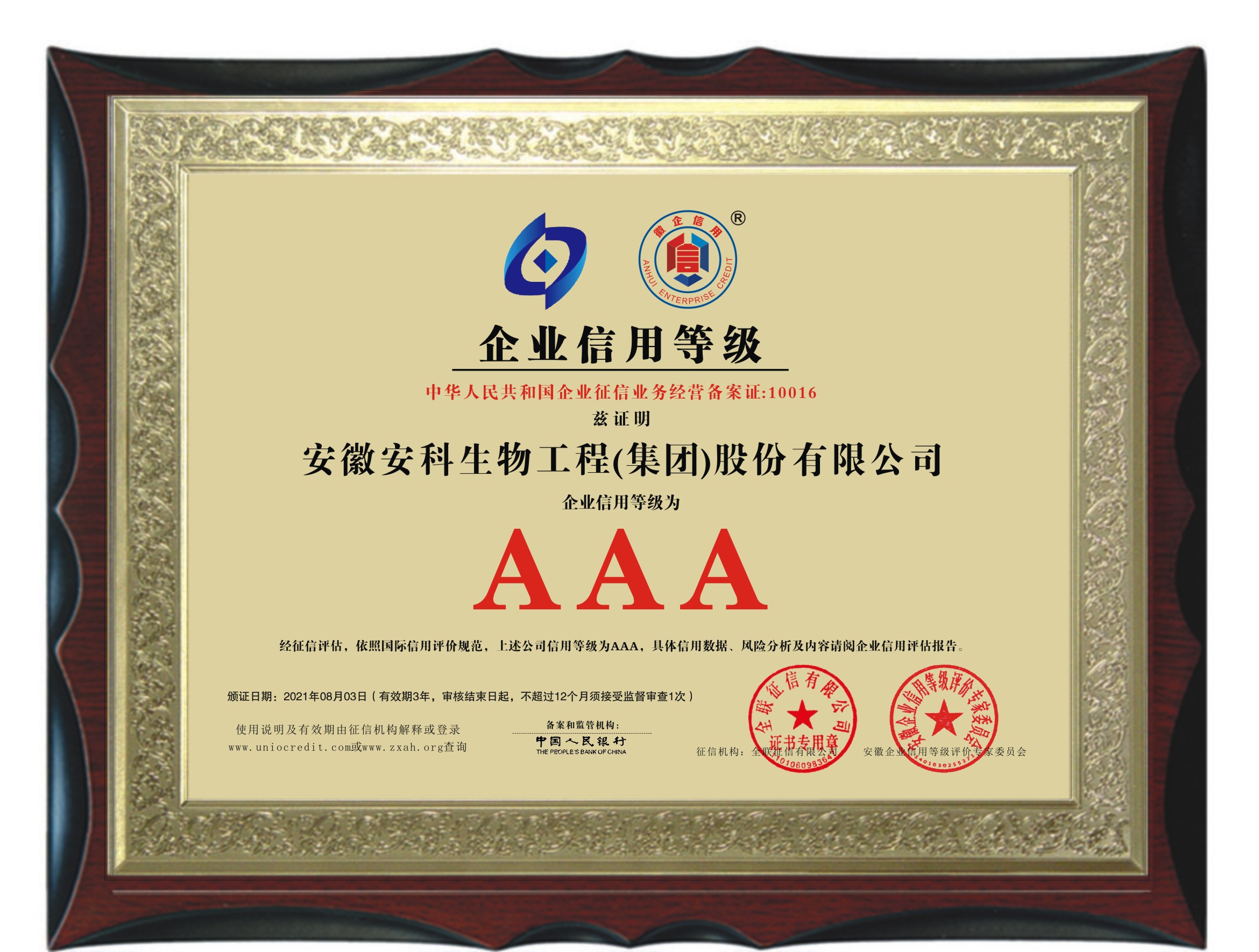 本次評選活動,由安徽企業信用等級評價專家委員會、安徽省創業創新企業家論壇組委會、安徽省企業經營與管理研究會、安徽省創新創業企業服務中心聯合組織開展。安徽省創業創新企業信用評價工作 2019 年、2020 年已連續開展兩年,為加快推進了我省社會信用體系建設,不斷提高安徽省創業創新中小企業誠信建設水平,推動企業誠信自律,提升企業信用風險防范能力,促進企業可持續發展。安徽 AAA 級信用企業作為安徽省企業信用評價中最高的信用等級,安科生物成功獲此殊榮,是公司整體綜合實力與競爭力的體現,同時也表示企業經營穩健,風險防范能力強。