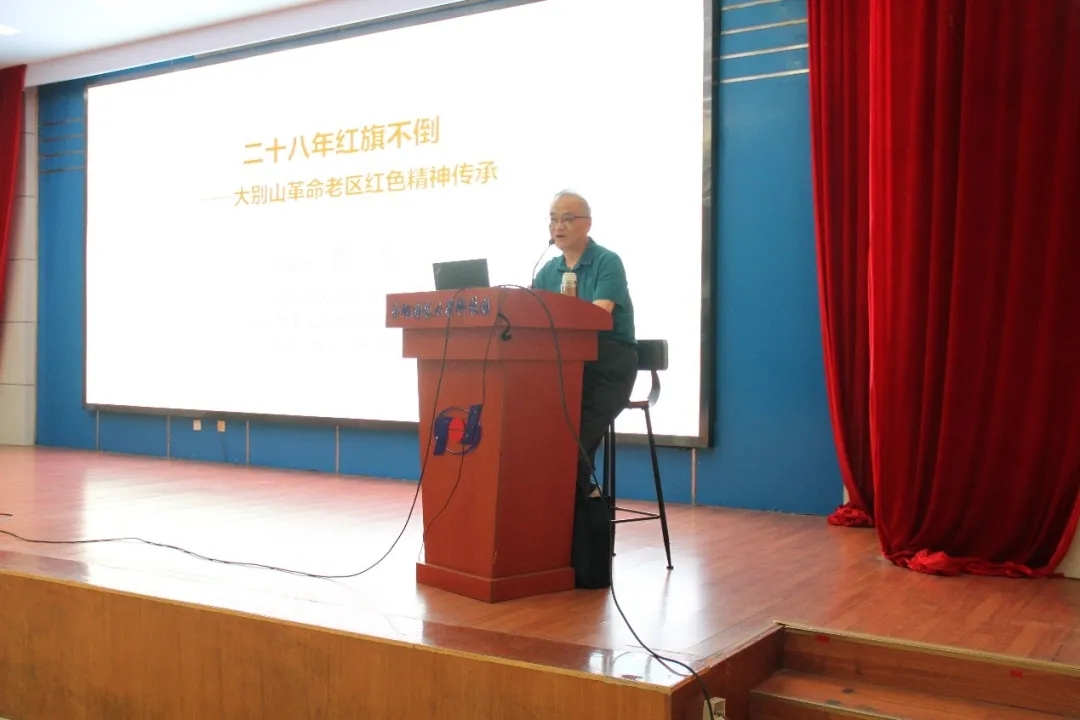 本次專題黨課特邀安徽省政府文史研究館翁飛教授以《二十八年紅旗不倒——大別山革命老區紅色精神傳承》為主題授課。翁飛教授以大別山的歷史文化為引,從大別山地區成立第一個黨組織、黃麻起義、立夏節起義、六霍起義等重要革命事件詳細解讀大別山革命老區人民在黨的領導下奮斗、奉獻、團結、進取的紅色文化內涵及精神,吸引在場黨員認真聆聽。