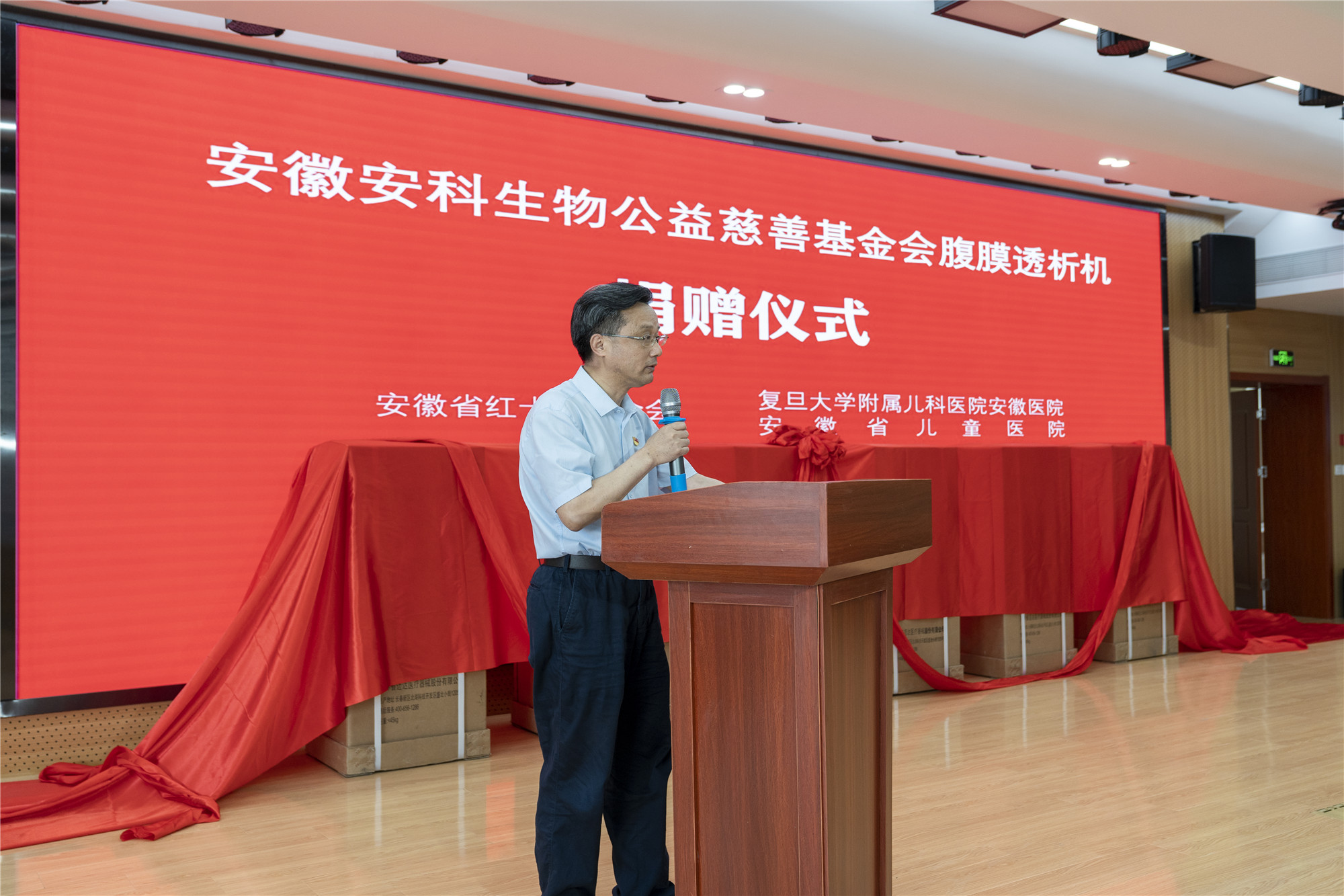 孔維鵬院長在講話中對安徽安科生物公益慈善基金會的捐贈表示感謝。他表示,醫(yī)院將積極履行社會責(zé)任,指導(dǎo)和幫助患兒家屬使用好腹膜透析機,為守護(hù)全省兒童健康、建設(shè)“健康安徽”作出更大貢獻(xiàn)。