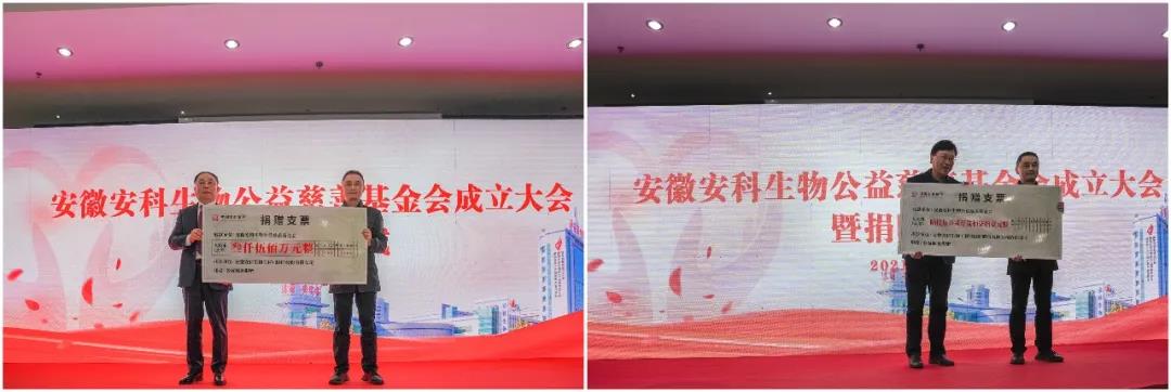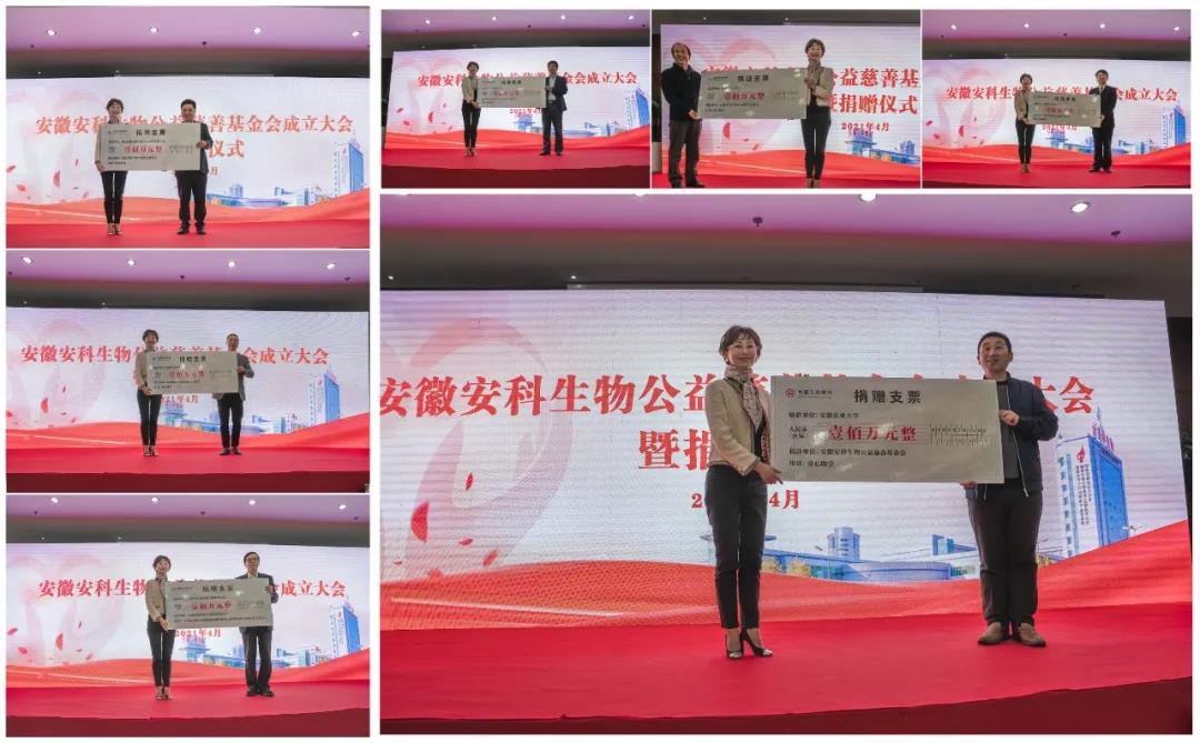 活動當天,安徽安科生物公益慈善基金會向安徽大學、安徽農業大學、安徽醫科大學、安徽中醫藥大學、安徽師范大學、溫州醫科大學 6 所高校分別捐贈獎助學金 100 萬元,助力困難學生更好完成學業,總額達 600 萬;向中華少年兒童慈善救助基金會“中國流動留守兒童體格發育研究和能力建設項目暨‘天使童行’公益項目捐贈 100 萬元,用于幫助更多生長發育關鍵時期的孩子們健康成長;向安徽省馬鞍山市當涂縣焦家社區老年人日間照料中心捐贈 100 萬元,用于關愛孤寡老人們的生活質量和身體健康。