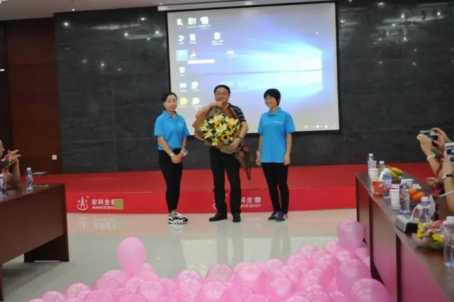 同學們現場為安科生物公司董事長 宋禮華老師 獻上一份愛的花束,感謝老師那些年的用心教導,一生受用不盡。