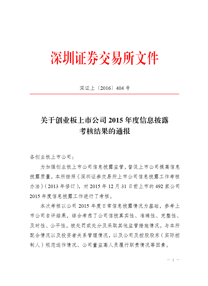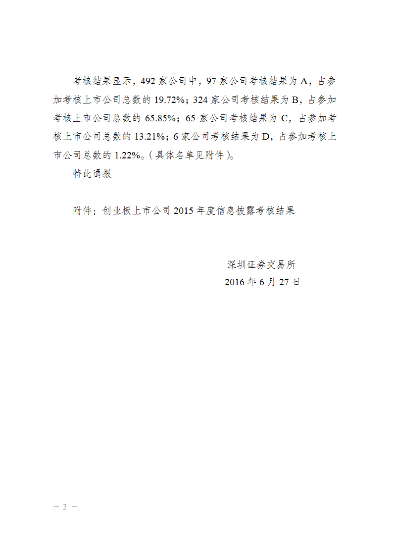深圳證券交易所6月27日發布《關于創業板上市公司2015年度信息披露考核結果的通報》(深證上〔2016〕404號),公布了它對2015年12月31日前上市的492家創業板公司2015年度信息披露工作所進行考核的結果。