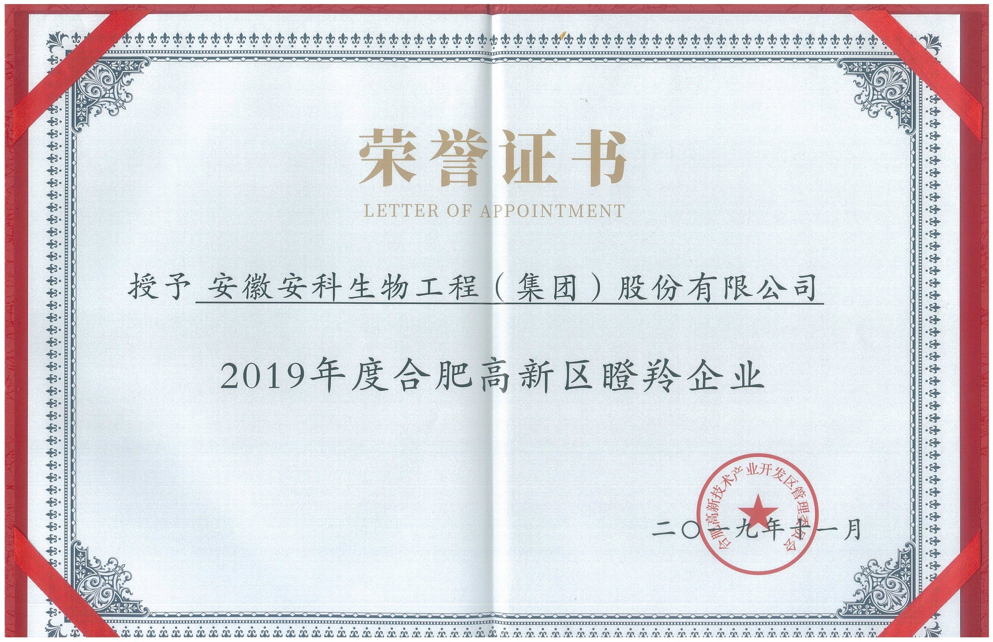 安科生物獲頒2019年度合肥高新區瞪羚企業