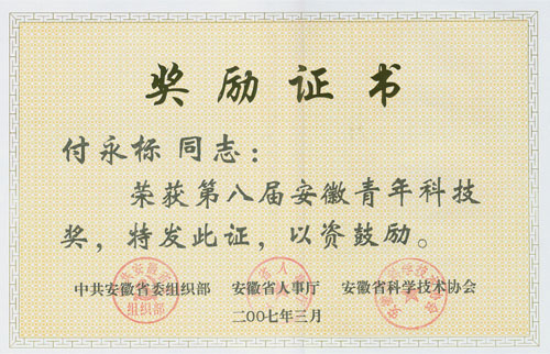 第八屆安徽青年科技獎日前隆重揭曉,20位青年科技英才獲此殊榮,我公司副總經理付永標同志作為20人之一,捧得了安徽青年科技獎的獎杯。