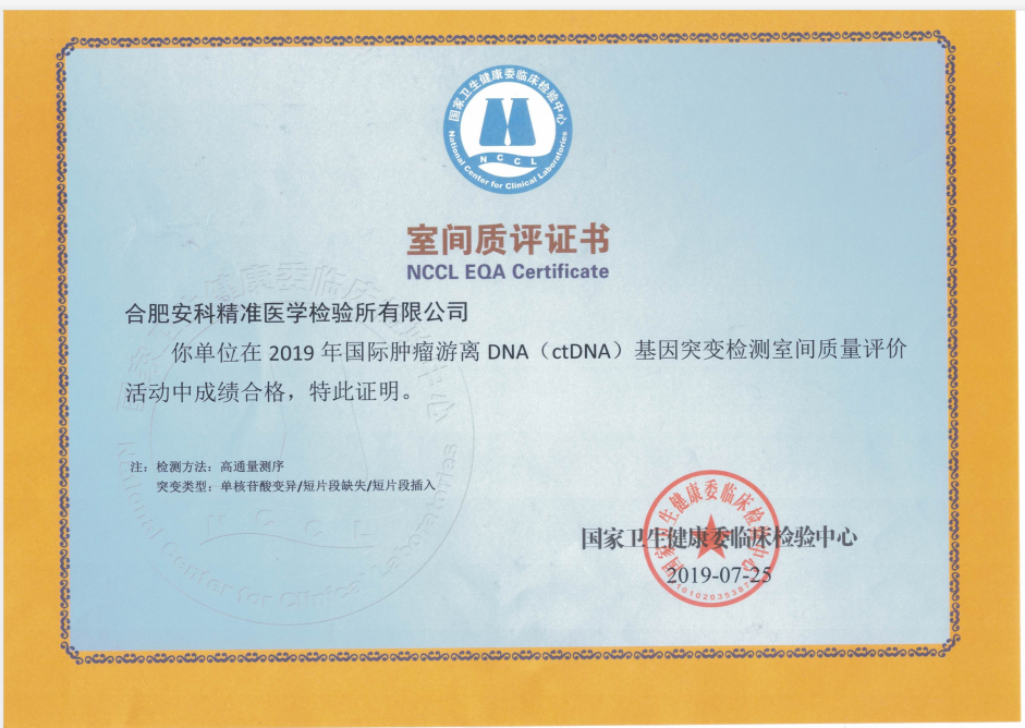 2019 年 7 月 25 日,安科生物全資子公司合肥安科精準醫學檢驗所實驗室順利通過 2019 年國際腫瘤游離 DNA(ctDNA)基因突變檢測室間質評,榮獲國家衛生健康委頒發的室間質評合格證書。為了解臨床實驗室 ctDNA 基因突變檢測的開展現狀及質量狀況,衛生部臨檢中心開展了該項目的室間質量評價。本次質評由衛生部臨床檢驗中心和澳大利亞皇家病理質控中心聯合開展,我國共有來自 19 個省(市、自治區)的 146 個實驗室參加,共計收到  125 個有效結果,滿分結果 53 個,結果滿分率僅 42.4%!