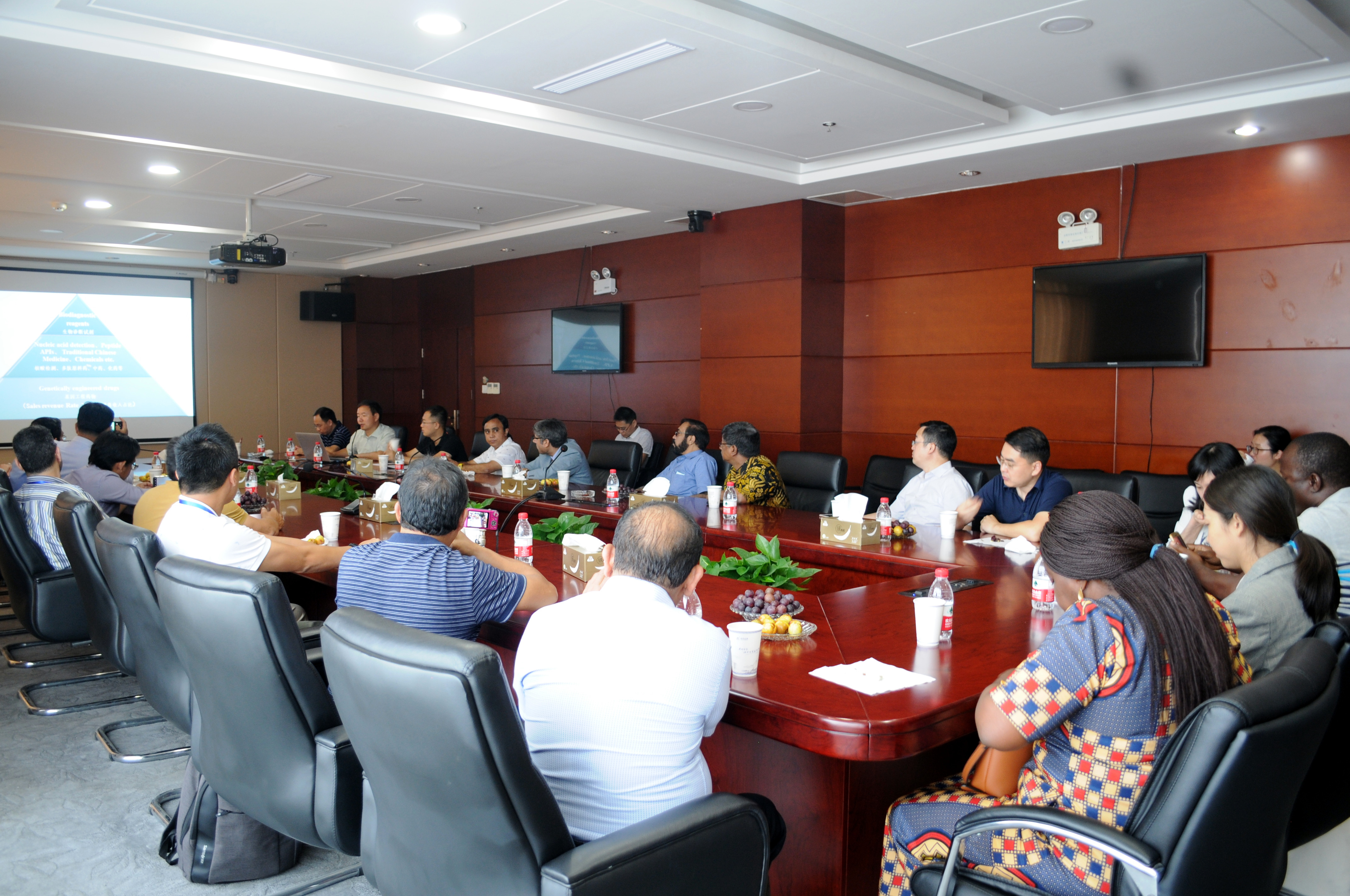 8 月 10 日上午,由科技部主辦、中國科技交流中心承辦的“科技政策與管理國際研修班”一行赴安科生物考察交流,該研究班是由來自 10 個發展中國家的 19 名政府部門及科研機構高級管理人員組成。公司分管研發工作的副總經理宋社吾博士、基因藥物工程研究中心副主任胡思怡博士、總工程師辦公室主任饒海軍一并參加了此次交流會。