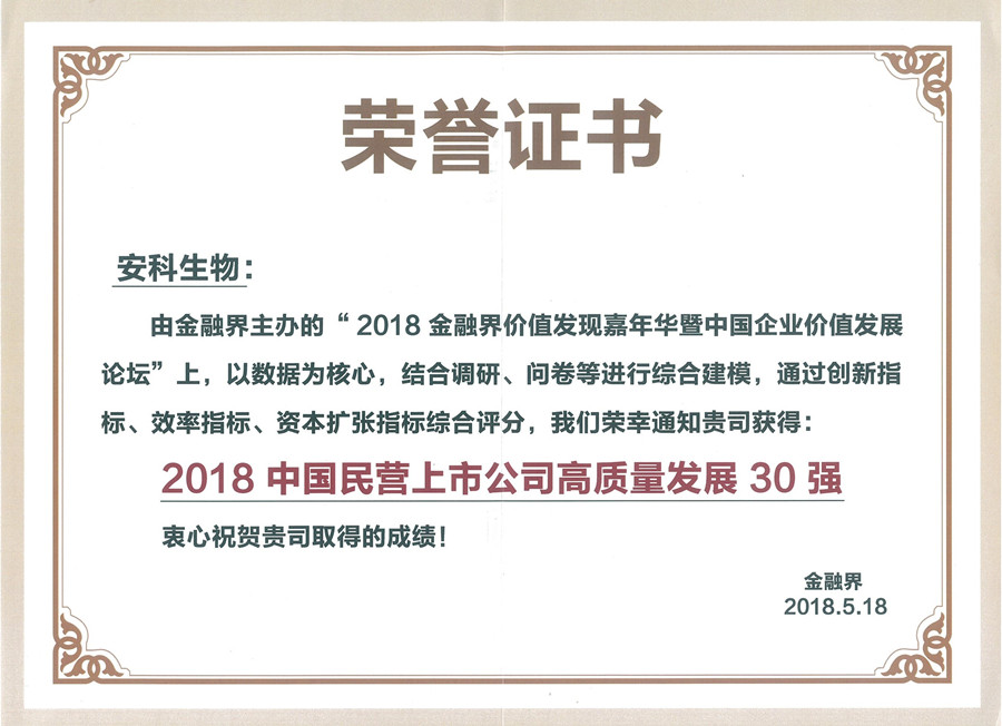 憑借著 2017 年在質(zhì)量發(fā)展綜合維度中的優(yōu)異表現(xiàn),安徽安科生物工程(集團(tuán))股份有限公司榮登“2018 中國(guó)民營(yíng)上市公司高質(zhì)量發(fā)展 30 強(qiáng)”榜單。該榜單是以創(chuàng)新、效率、可持續(xù)資本擴(kuò)張三大維度為高質(zhì)量發(fā)展評(píng)價(jià)基石,以 A 股民營(yíng)上市公司 2017 年年報(bào)數(shù)據(jù)為研究標(biāo)的,用大數(shù)據(jù)信息挖掘、實(shí)證研究邏輯推導(dǎo)錨定上市公司高質(zhì)量發(fā)展水平,綜合平衡后甄選出的位于發(fā)展質(zhì)量頭部的民營(yíng)上市公司。