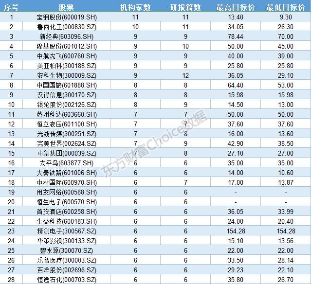 在機構一致看多的名單之中,安科生物榮登榜首,共有12家機構對其作出評級,并給出一致看多的建議。寶鋼股份、魯西化工、隆基股份、新經典、美亞柏科、完美世界等個股也備受機構青睞。