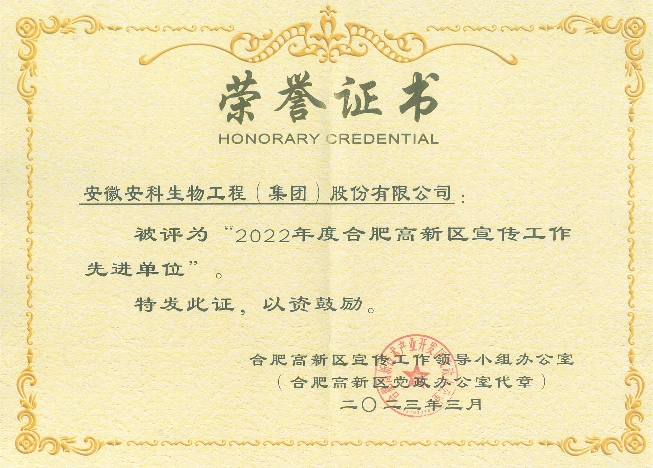 3月22日,合肥高新區黨建工作部在高新區管委會一樓多功能廳組織召開2023年度黨建工作會議,安科生物黨委書記汪灶標受邀參會。會上對榮獲2022年度五星級黨組織稱號的基層黨組織集中授牌,為獲評2022年度宣傳工作先進單位、個人代表頒發了榮譽證書。安科生物同時獲頒合肥高新區五星級基層黨組織和2022年度合肥高新區宣傳工作先進單位榮譽稱號,企劃與品牌管理中心張靜榮獲2022年度合肥高新區宣傳工作優秀通訊員稱號。