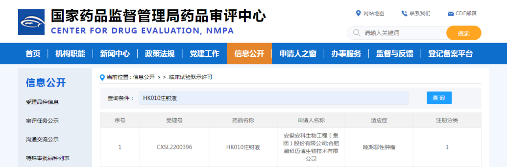 2022 年 11 月 1 日,據(jù)國家藥監(jiān)局藥品審查中心(CDE)官網(wǎng)-臨床默示許可顯示,安科生物與瀚科邁博合作開發(fā)的HK010注射液的臨床試驗申請獲批(受理號:CXSL2200396),適應癥為晚期惡性腫瘤。