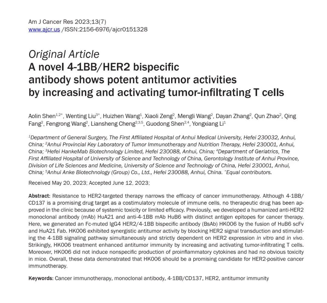 瀚科邁博雙抗HK006注射液研究成果發(fā)表于《American Journal of Cancer Research》