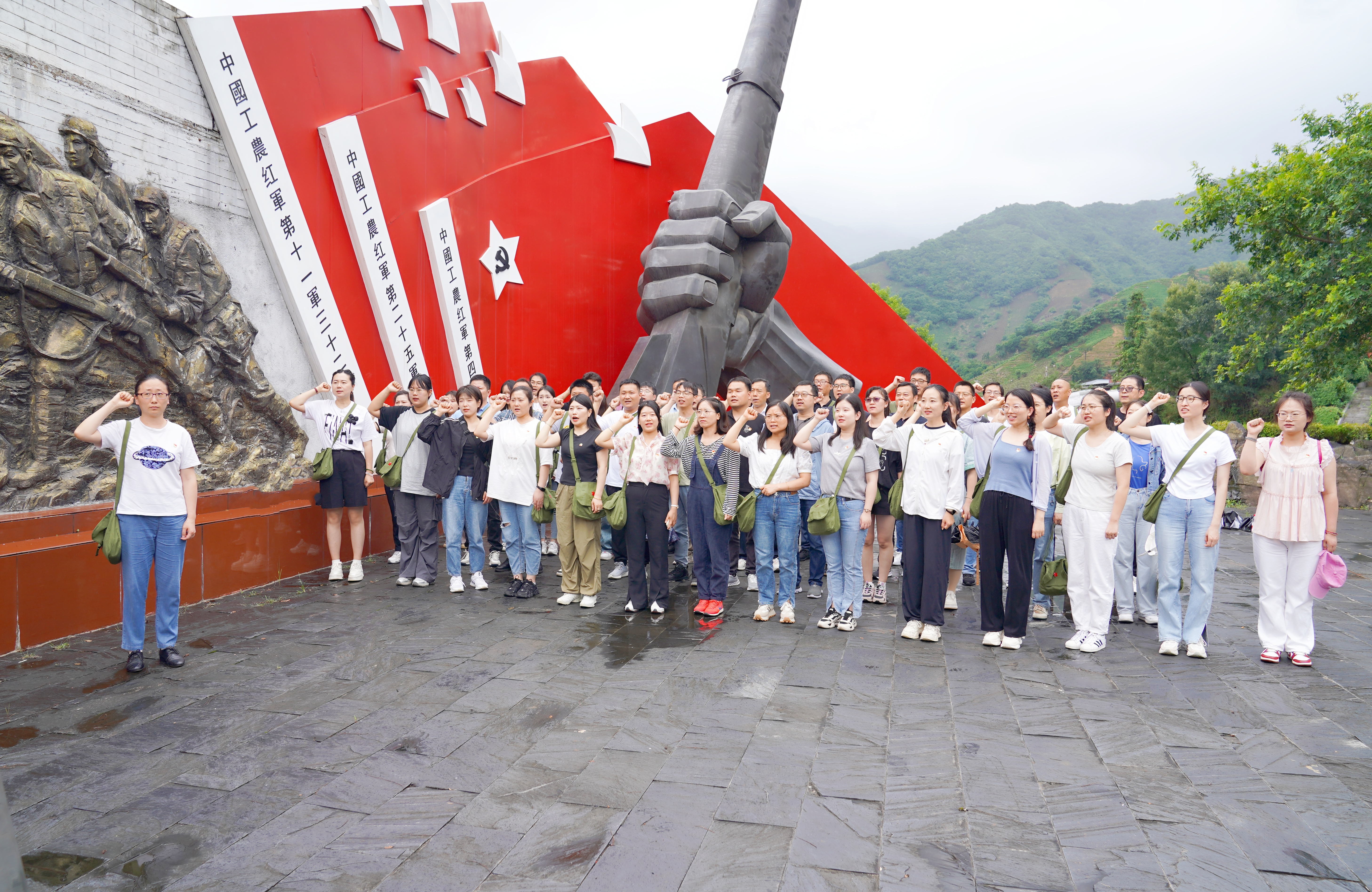 經過三個小時的車程,安科生物黨員干部們來到了紅色底蘊深厚、風景優美的鄂豫皖革命根據地發祥地之一,商城縣大別山精神文化傳承中心,同時它也是大別山金剛臺紅軍洞群所在地?!拔抑驹讣尤胫袊伯a黨,擁護黨的綱領,遵守黨的章程......”在進入革命歷史展覽館之前,黨員干部們在合肥市優秀共產黨員程婷同志的帶領下,站在“紅旗不倒”雕塑前,面對入黨誓詞文化墻,重溫入黨誓詞,砥礪前進初心。一句句鏗鏘有力的誓言聲,喊出了安科生物黨員干部們傳承與弘揚大別山精神、革命先烈的優良傳統和作風的決心。