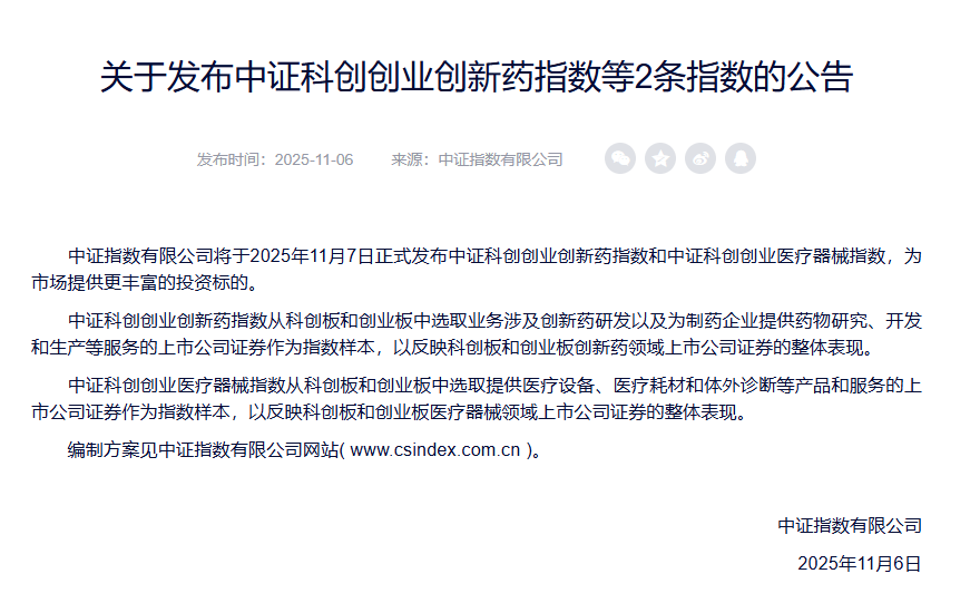 2025年11月7日,中證指數有限公司正式發布“中證科創創業創新藥指數”,該指數從科創板和創業板中選取業務涉及創新藥研發及相關服務的上市公司證券作為指數樣本,旨在反映科創板和創業板創新藥領域上市公司證券的整體表現。此次發布的指數共納入50家上市公司,安徽安科生物工程(集團)股份有限公司入選成份股。