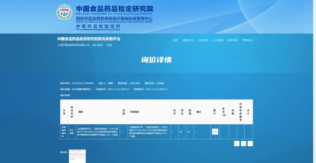 2025年11月20日,中檢院公開詢價采購生長抑素標(biāo)準(zhǔn)物質(zhì)原料,發(fā)布生長抑素標(biāo)準(zhǔn)物質(zhì)原料詢價公告,誠邀符合項目技術(shù)要求、資格要求的供應(yīng)商參加。作為國內(nèi)多肽原料藥領(lǐng)域的重要企業(yè),蘇豪逸明積極響應(yīng)、精心籌備,于12月11日正式收到官方中選通知。
