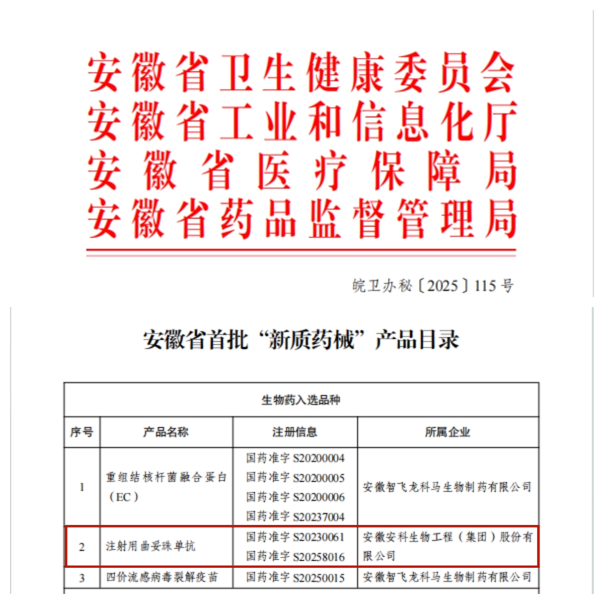 近日,安徽省衛生健康委員會、安徽省工業和信息化廳、安徽省醫療保障局及安徽省藥品監督管理局聯合印發《關于發布安徽省首批“新質藥械”產品目錄的通知》(皖衛辦秘〔2025〕115號),安徽安科生物工程(集團)股份有限公司自主研發的注射用曲妥珠單抗(商品名:安賽汀®)成功入選。在本次入選的生物藥品種中,安賽汀®是唯一一個抗腫瘤單抗藥物。
