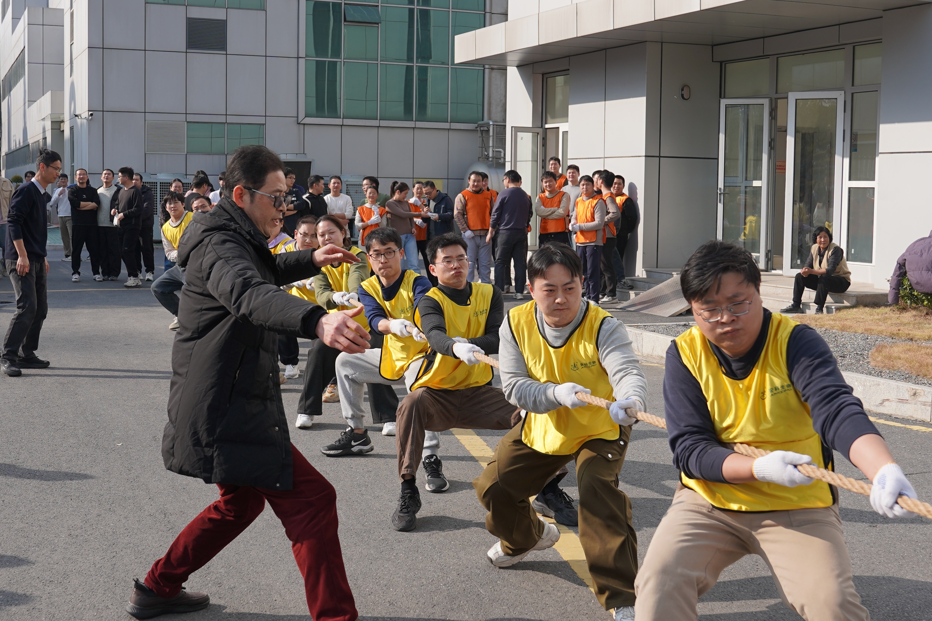 粗壯的麻繩被一雙雙有力的大手緊緊攥著,繃得筆直,繩子兩邊的隊員身體后仰、雙腳蹬地,周圍觀眾的吶喊聲震耳欲聾。這里,就是安科生物2026年度職工拔河比賽的現場!